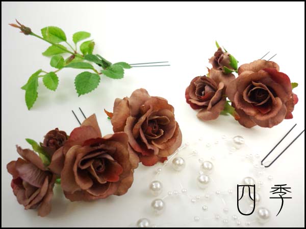 |   | 四季 > コサージュ > リンツ*髪飾り*ブラウン*ミニ薔薇*Uピン*4点* パールビーズ♪ |   |