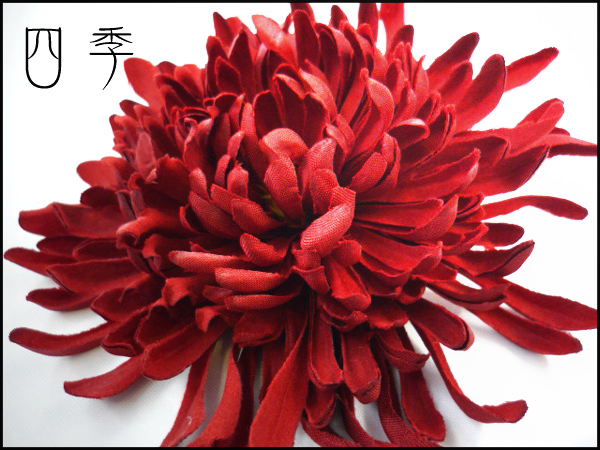 万葉菊*(赤)*マム*コサージュ*髪飾り*帯飾り♪●金額 売切れ中止●サイズ ・ 花径 12cm(Wクリップピン付き) ●商品説明 ・ 上質なアートフラワーを使って心をこめてお作りしました。 ・ 繊細な細い花びらが中心から伸びやかに広がっています、つややかなレッド(濃赤)がステキなコサージュでございます。 ・ Wクリップピン(台付き金具にネクタイピンのように挟むクリップとコサージュ用安全ピン付)がついていますので髪飾り・コサージュ・帯飾りにお使いいただけます ・ Uピン・ヘアクリップ・ヘアゴムへの変更の加工も無料で承ります ・ 箱(無料)に入れてお届けいたします。 ●支払い方法 ・ ゆうちょ銀行 (ぱるる) ・ イーバンク銀行 ・ ジャパンネット銀行 ・ 代金引換:商品代+送料+代引手数料 ●発送方法 ■郵便 ・(定形外)全国一律240円(不着や破損の保証はありません・郵便番号をお願いします) ・郵便扱いですので代金引換はできません・しっかりした箱(無料)でお届けいたします。 ■佐川急便(不着や破損の保証がついています)