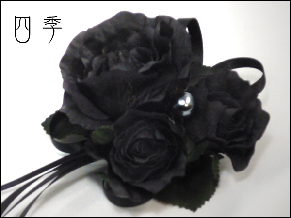 シフォン*コサージュ*ブラック*黒*パール*黒リボン♪●金額 2,400円●サイズ ・ 直径 9〜10cm(Wクリップピン付き) ・ 全長 22cm(リボンを含みます) ●商品説明 ・上質なアートフラワーを使った髪飾り・コサージュを一つ一つ心をこめてお作りしています。 ・ 美しい漆黒薔薇の中心に鈍く光るブラックパール(フェイク)を乗せています、暗緑のリーフをベースにして細身のブラックサテンリボン4本がリズミカルなラインを奏でています。 ・ Wクリップピン(台付き金具にネクタイピンのように挟むクリップとコサージュ用安全ピン付)がついていますので髪飾り・コサージュ・帯飾りにお使いいただけます ・ Uピン・ヘアクリップ・ヘアゴムへの変更の加工も無料で承ります ・ 箱(無料)に入れてお届けいたします。 ●支払い方法 ・ ゆうちょ銀行 (ぱるる) ・ イーバンク銀行 ・ ジャパンネット銀行 ・ 代金引換:商品代+送料+代引手数料 ●発送方法 ■郵便 ・(定形外)全国一律240円(不着や破損の保証はありません・郵便番号をお願いします) ・郵便扱いですので代金引換はできません・しっかりした箱(無料)でお届けいたします。 ■佐川急便(不着や破損の保証がついています)