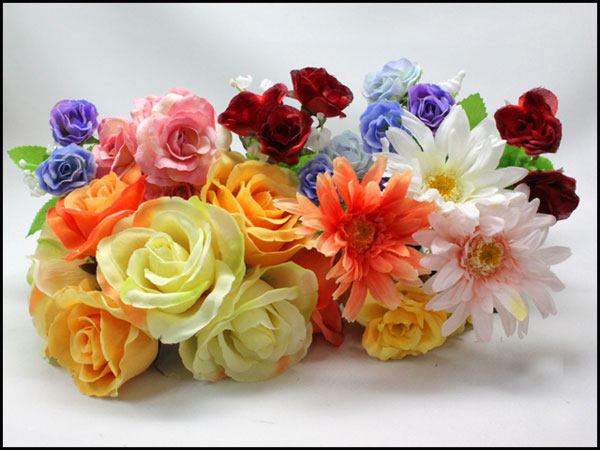 制作の際には花冠に合わせてバランスを整えるよう心がけました。 左下はブートニアでございます。 平成23年9月6日 島岡さま、お待たせいたしました。カラフルな花冠のブーケの材料が揃いました、ほとんど花冠と同じ材料ですのでいかがでしょうか。 花冠に合わせてブーケを制作いたします。 平成23年8月26日 |