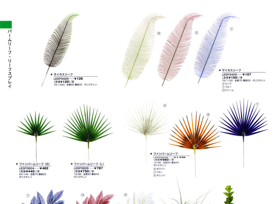 造花、パームリーフ・リーフスプレー:サイカスリーフ、ファンパームリーフ(S)、ファンパームリーフ(L)、マグノリアリーフスプレイ、ベアグラススプレイ、ユーカリスプレイ、アジアンタムスプレイ、ミニスウェーデンアイビースプレイ、ウッディスプレイ、イングリッシュアイビースプレイが掲載されています。