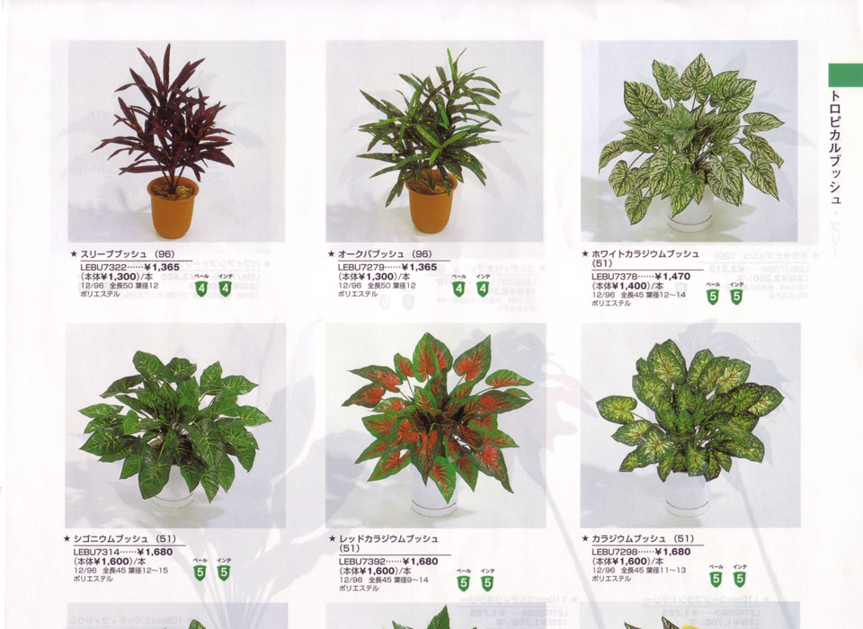 造花、カラジウムブッシュ:カラジウムポット、スリープブッシュ、オークバブッシュ、ホワイトカラジウムブッシュ、シゴニウムブッシュ、レッドカラジウムブッシュ、ピーコックブッシュ、ホスタブッシュ、ゼブラブッシュ、アンスリウムブッシュ、スパッティフィリウムブッシュが掲載されています。